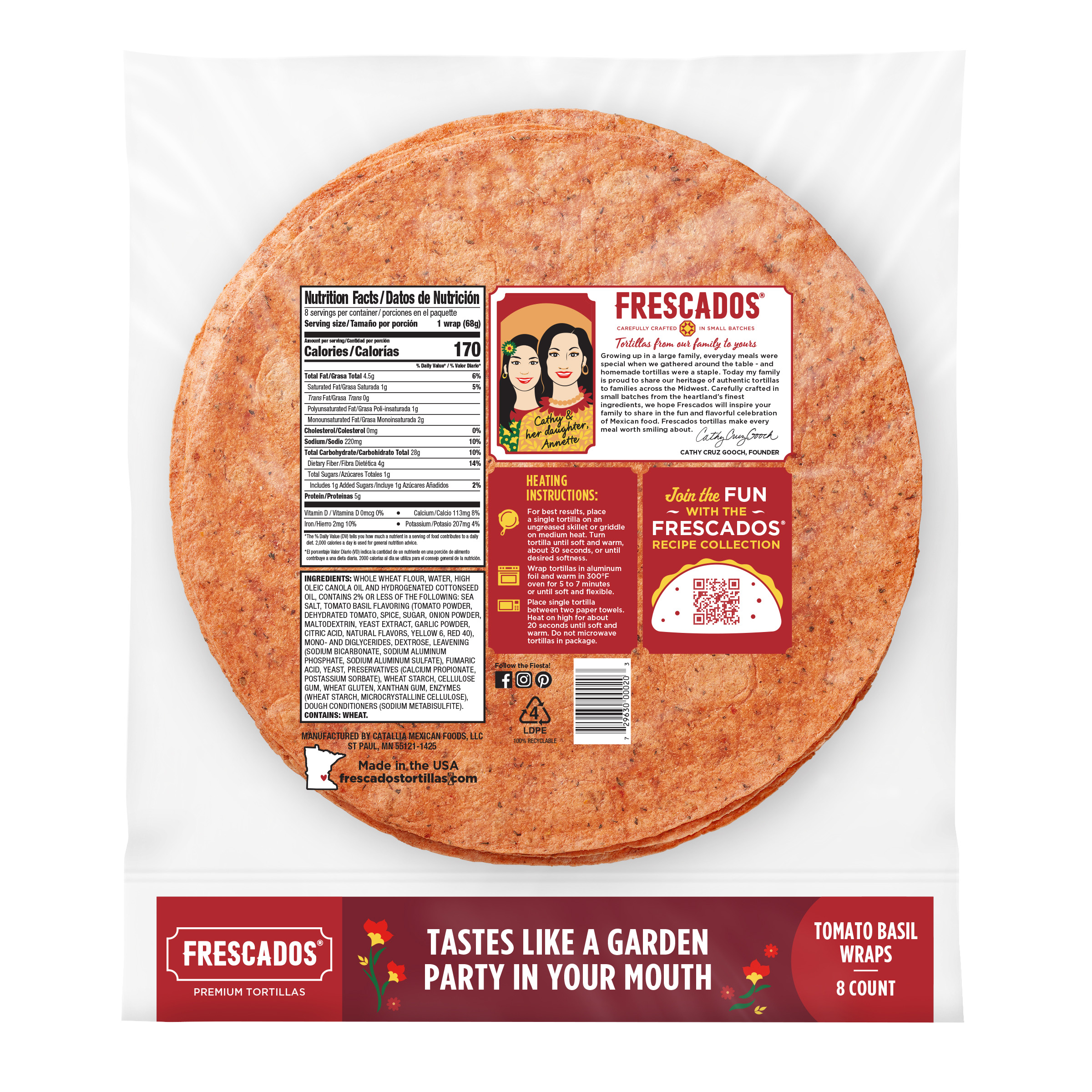 Frescados 10” Tomato Basil Wrap is enhanced with zesty herb flavors and aromas. Packed with rich, savory flavors, they are the ultimate ingredient to wrap up a Caesar salad or to create a Margarita flatbread pizza for an easy meal or snack. 100% whole grain and certified by the American Heart Association as a Heart-Healthy option.